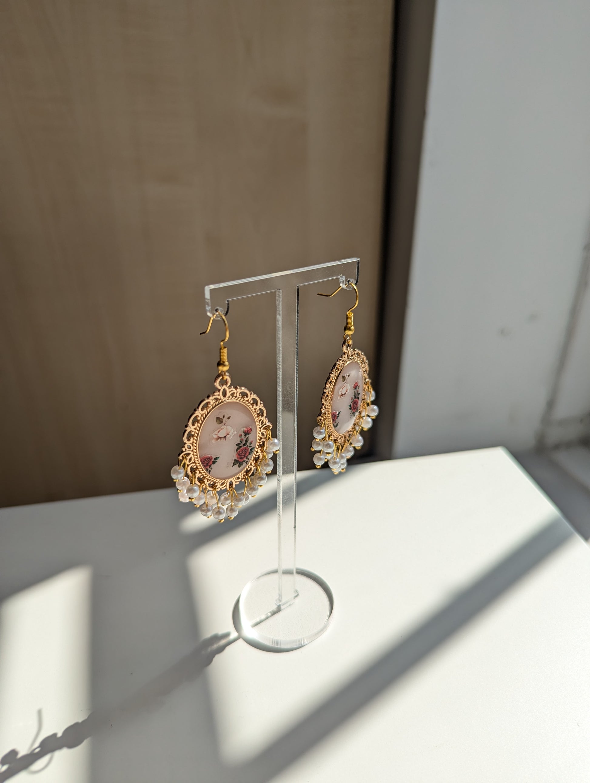 White floral resin earrings in Gold