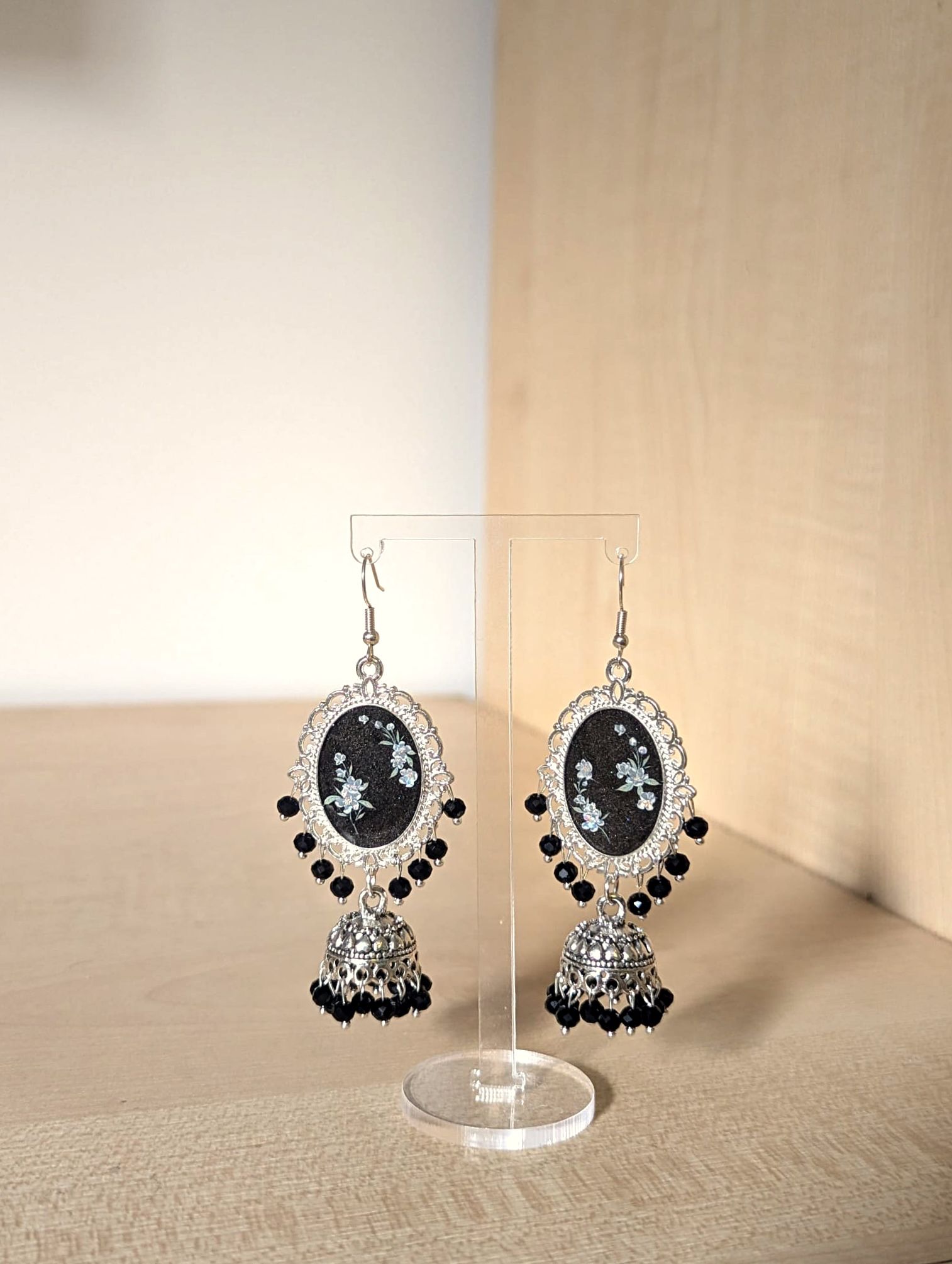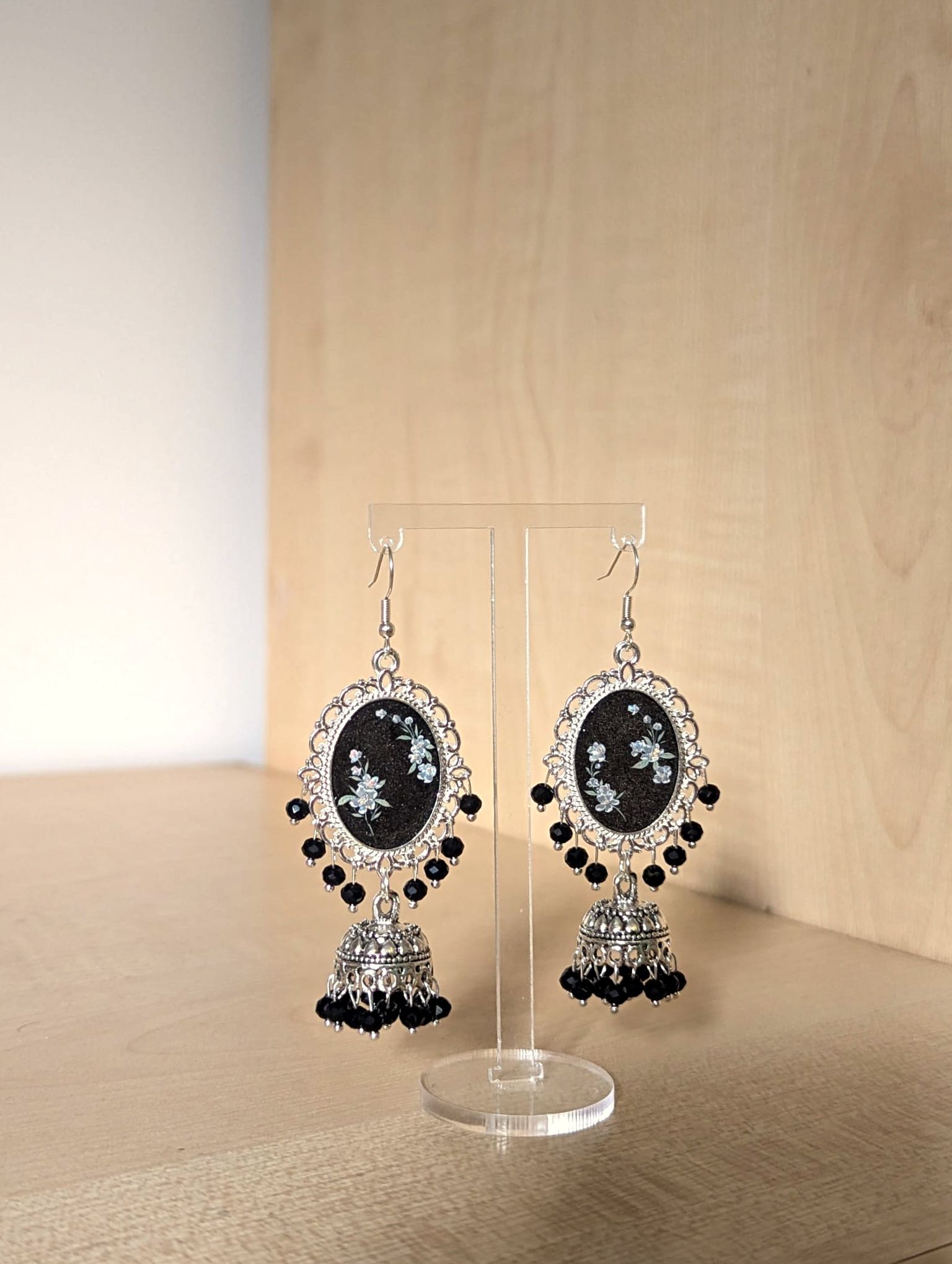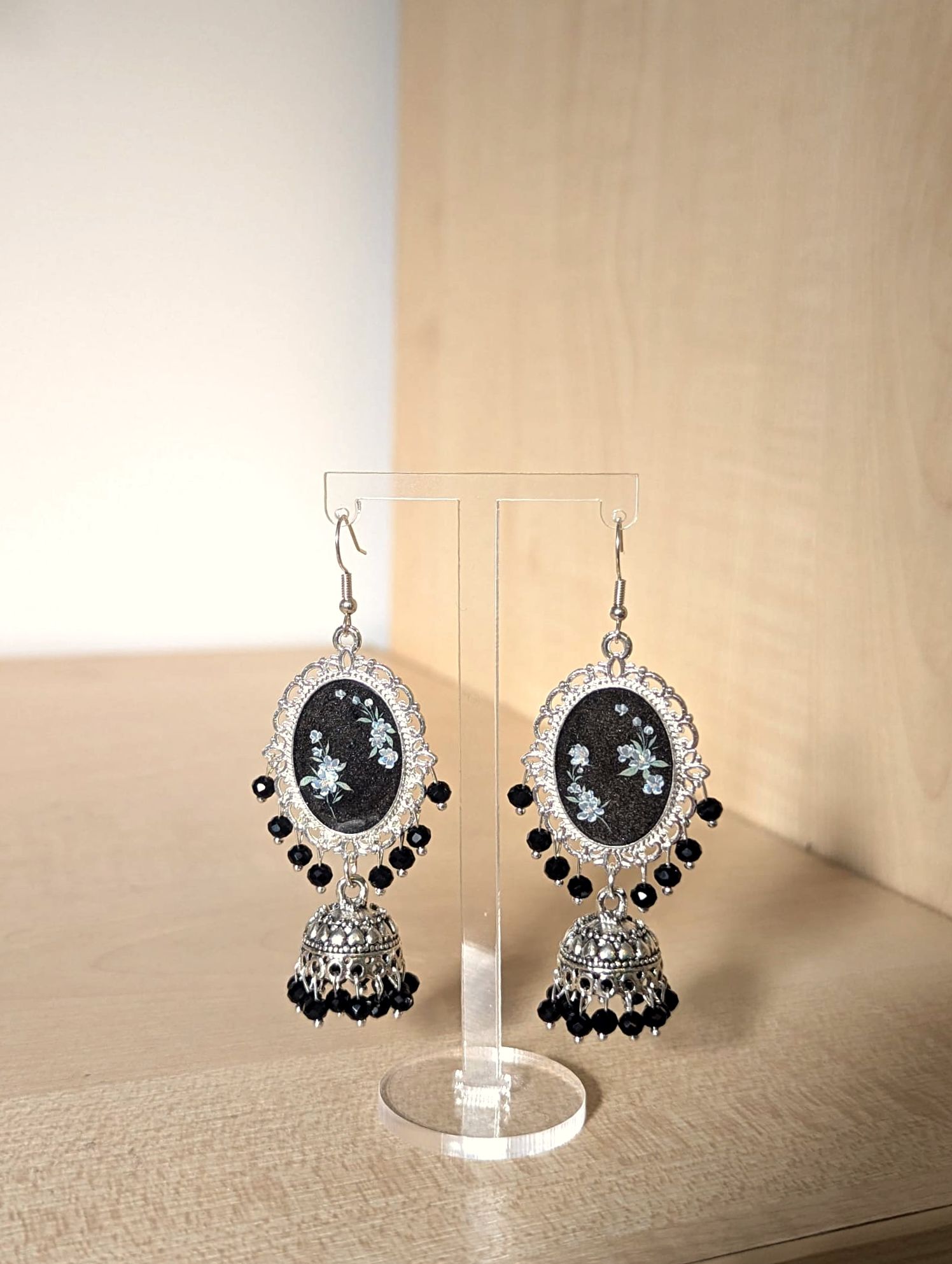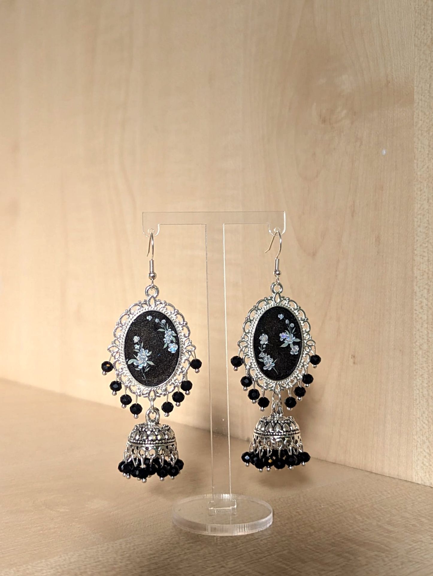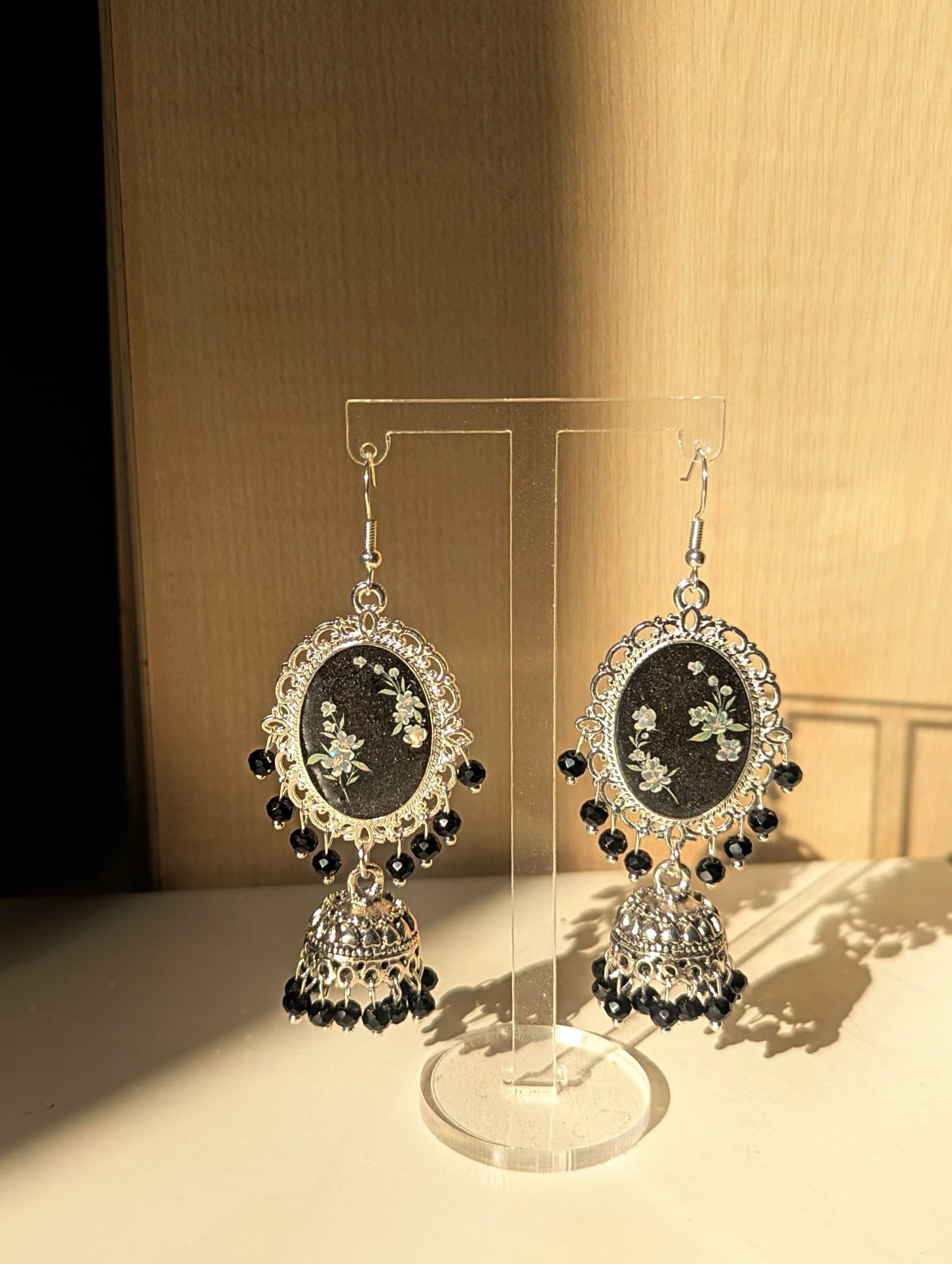 White intricate flowers on a black resin base in a silver frame and with silver jhumkay