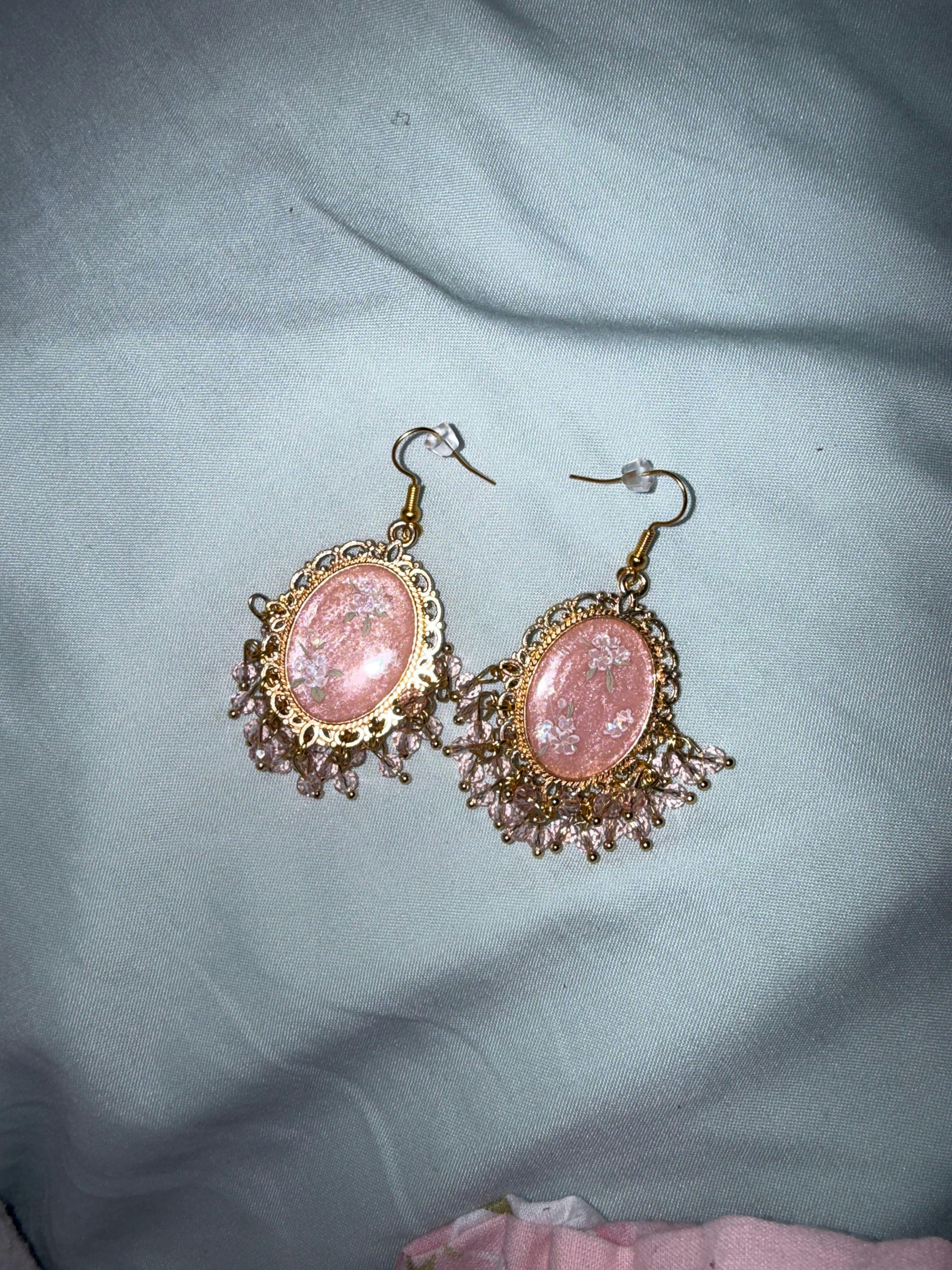 White delicate flowers on peach pink resin base with light pink crystal beads on a gold frame