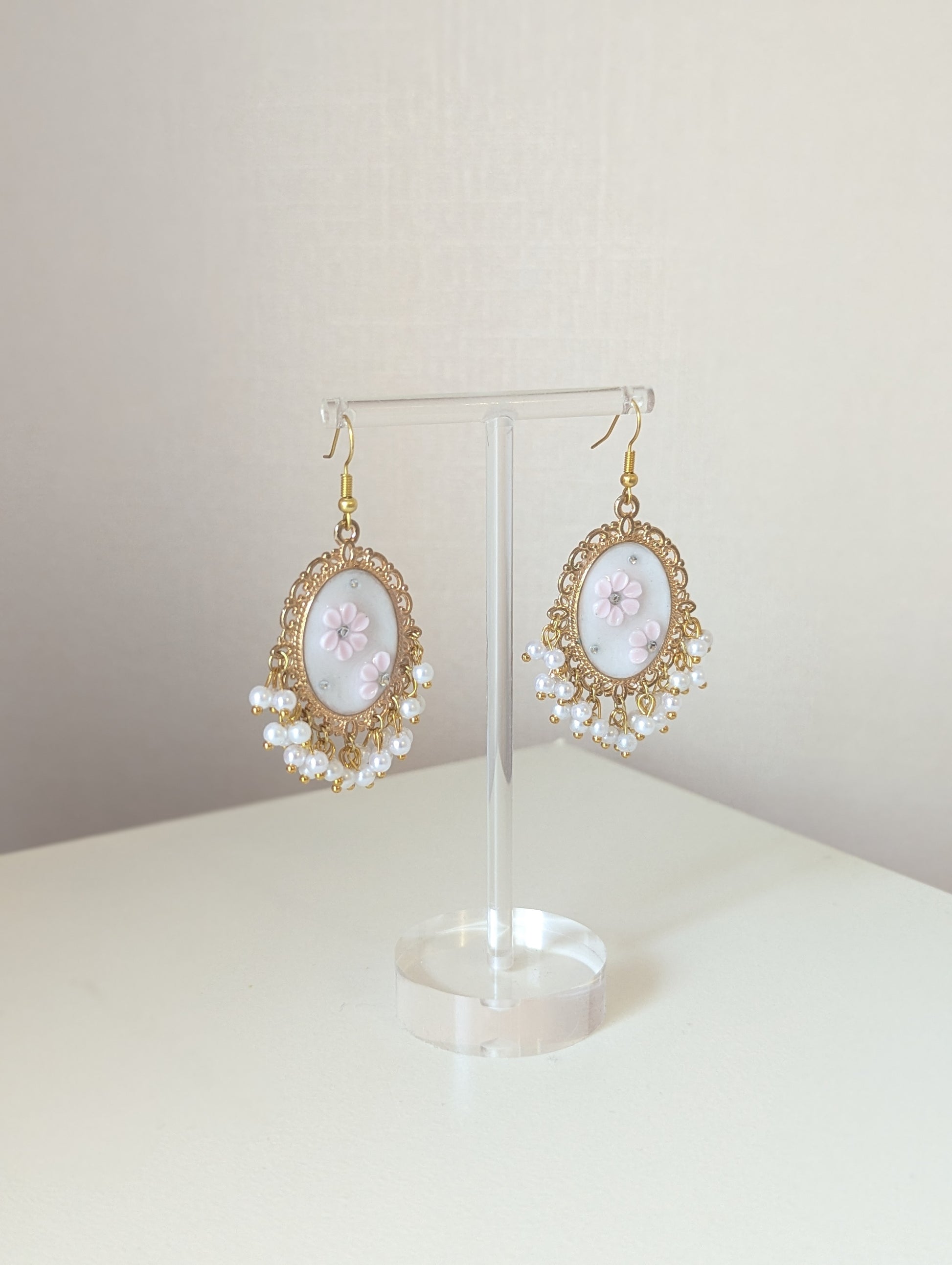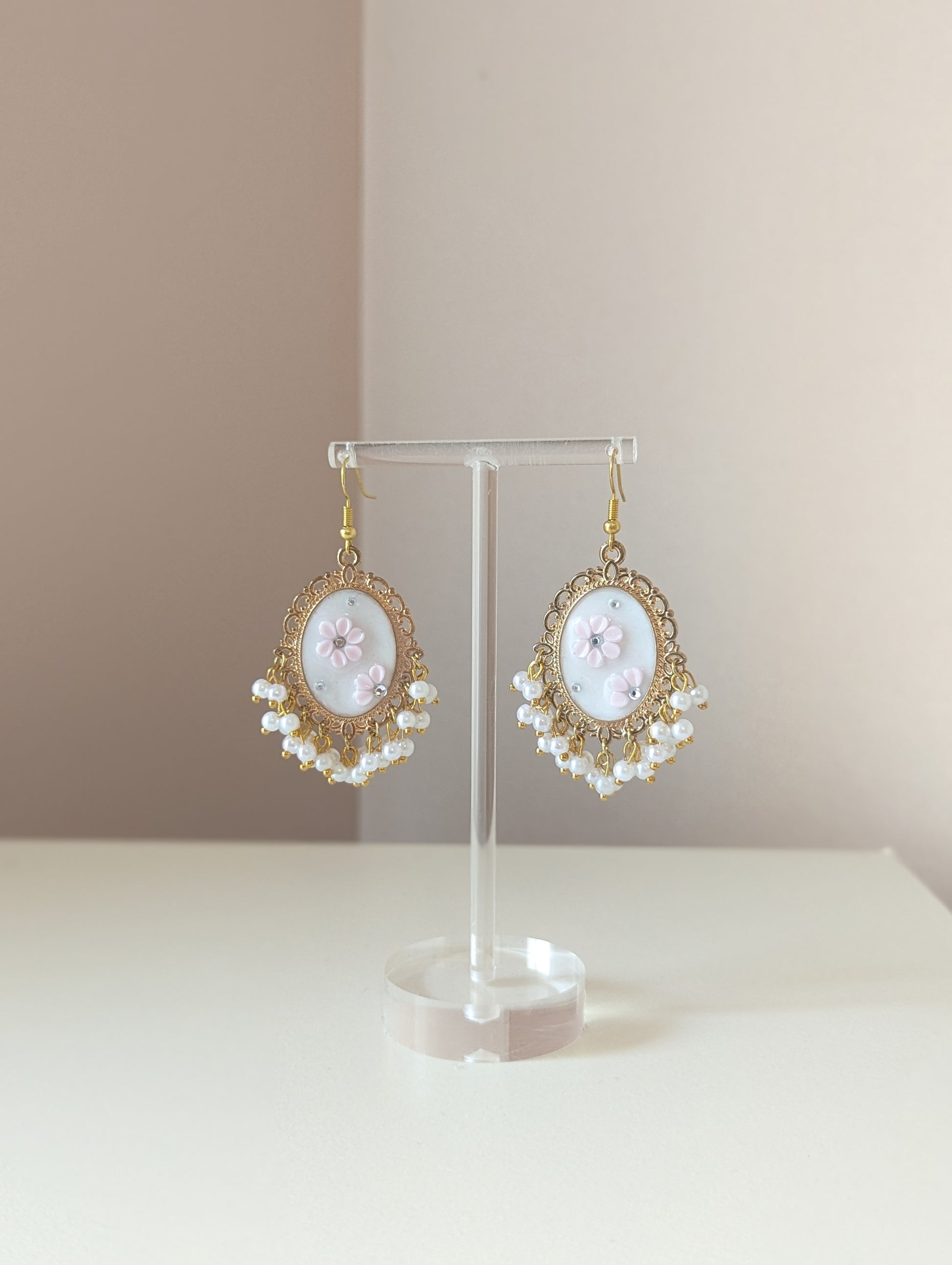 Hand made earrings - Pink floral charms on white resin base, in a KC gold coloured frame, decorated with white pearls