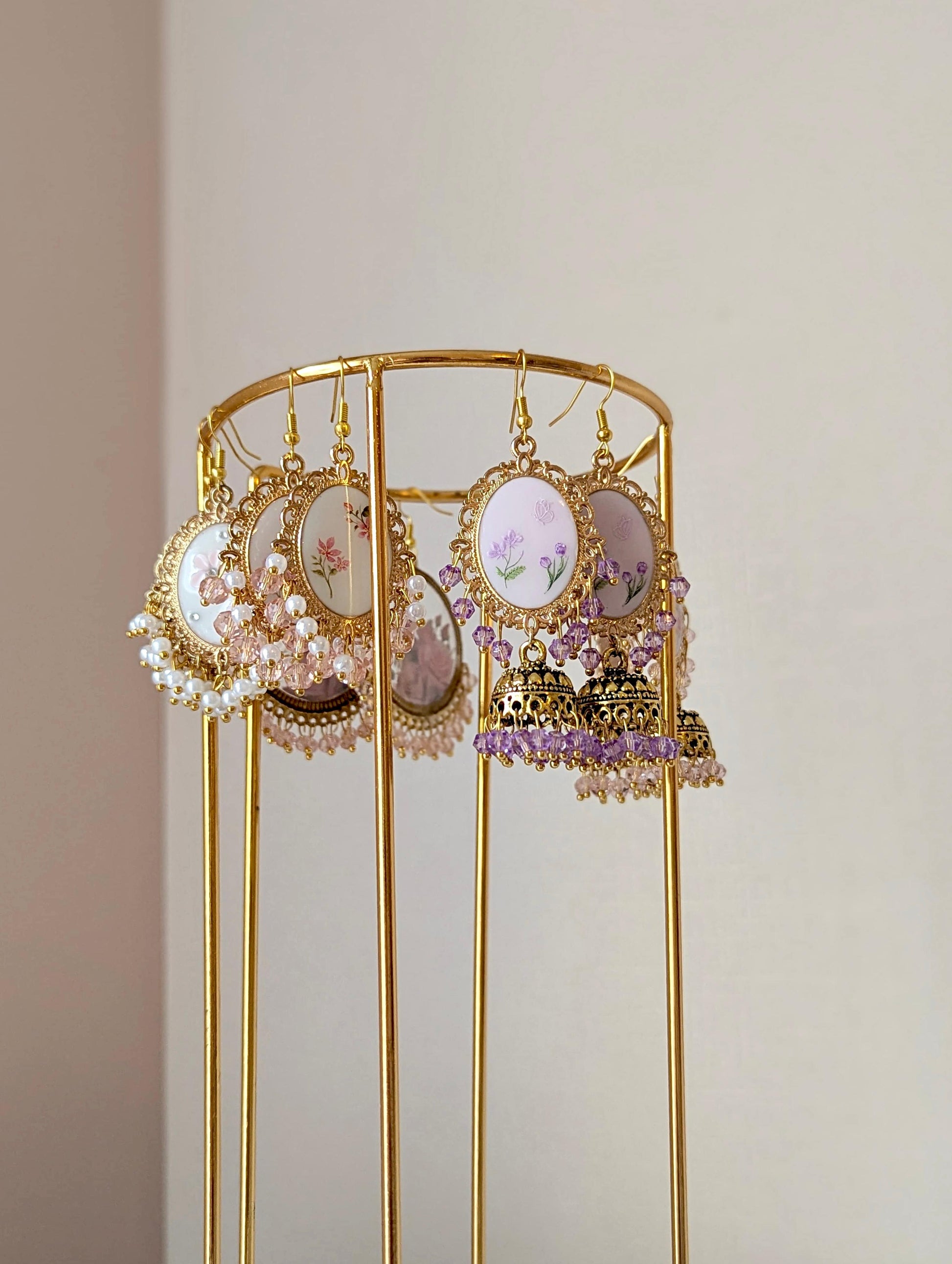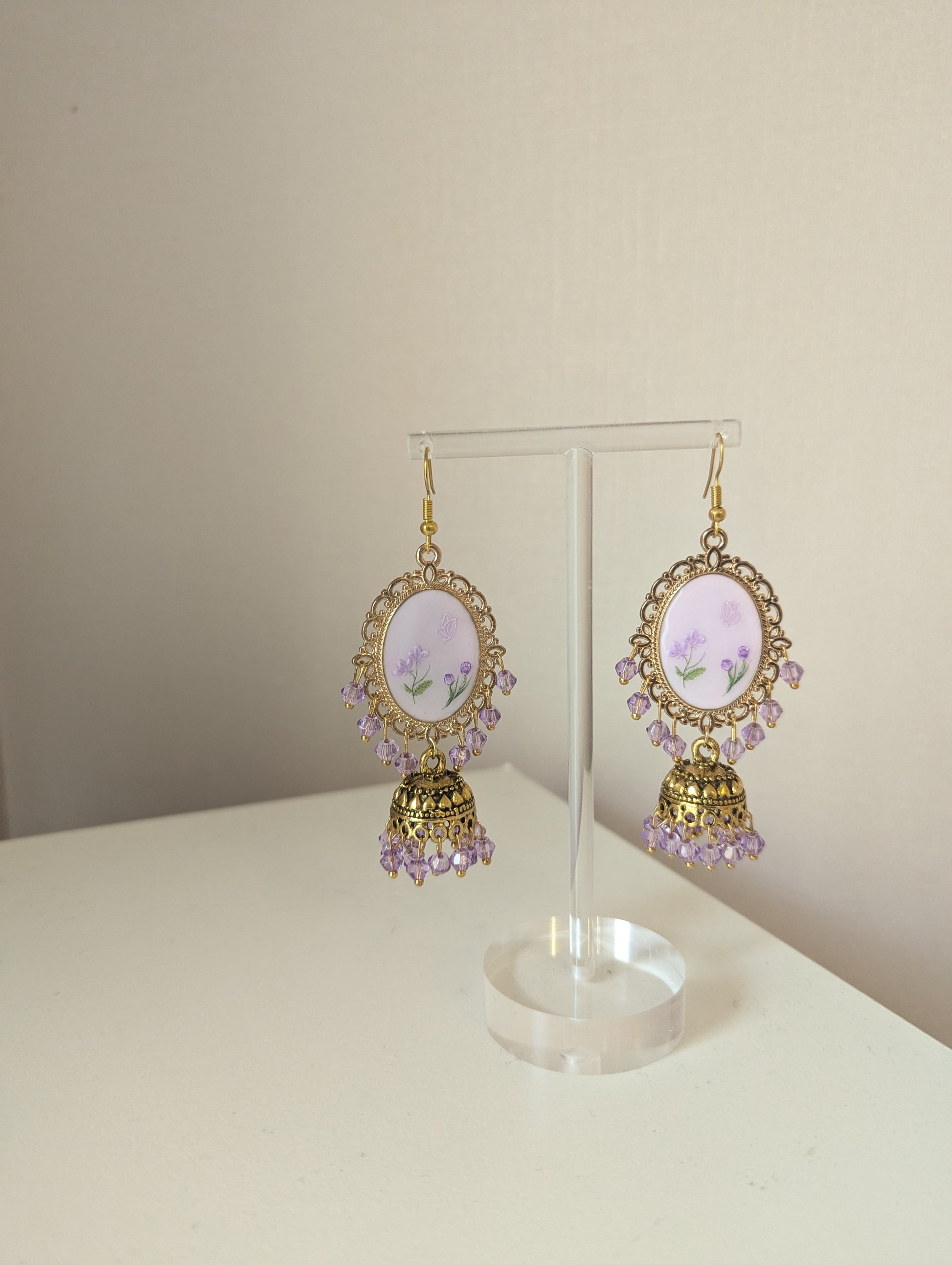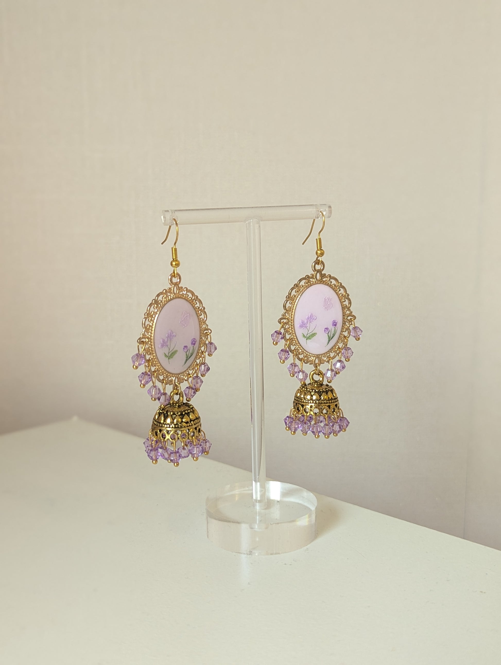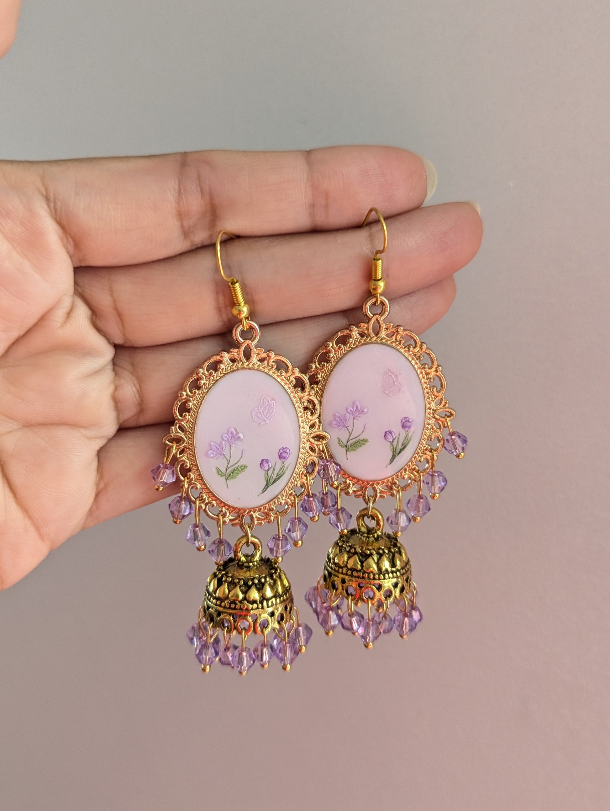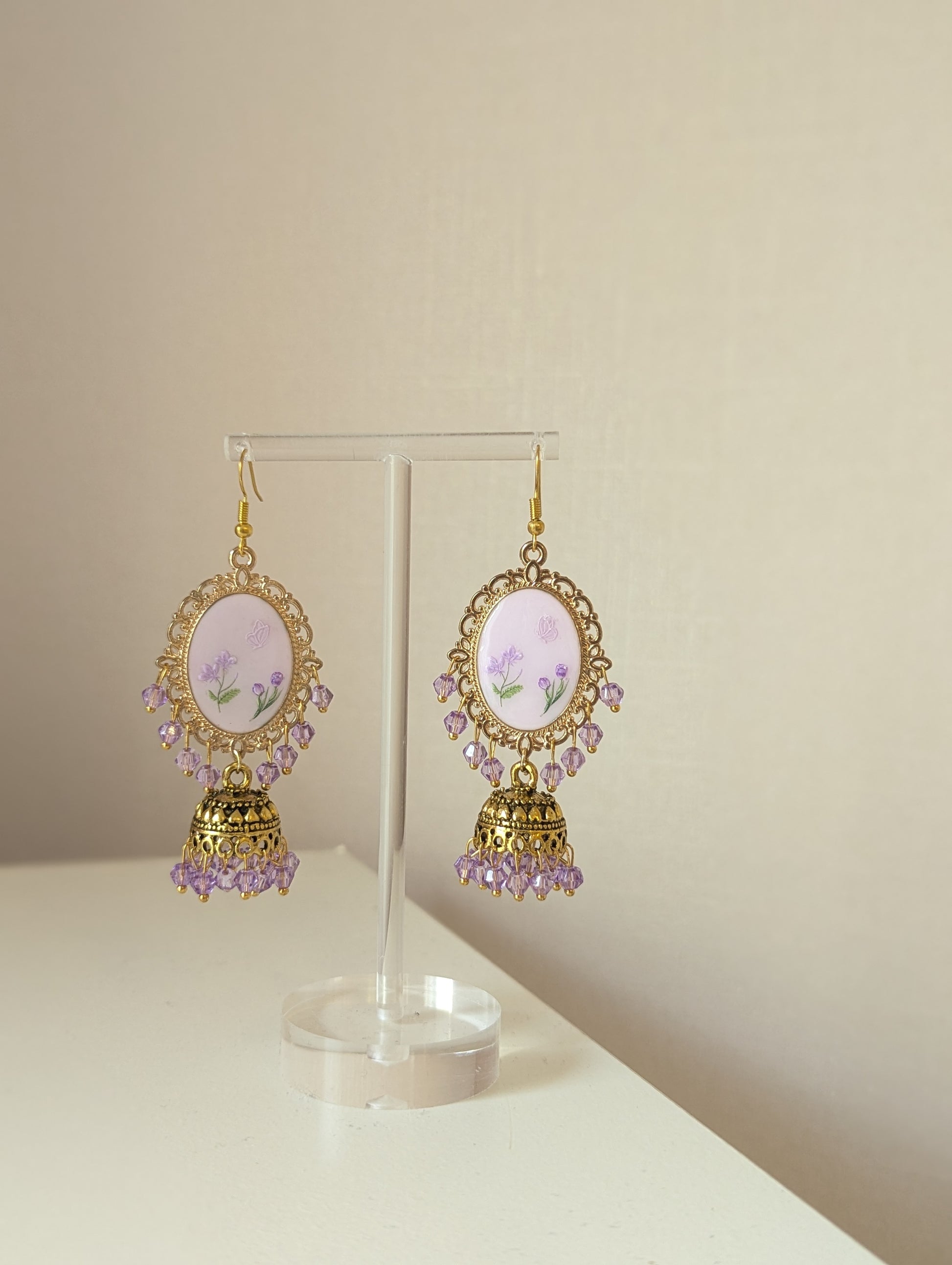 Intricate flowers and a delicate butterfly on purple resin base in a gold frame with jhumka drop and purple crystal beads