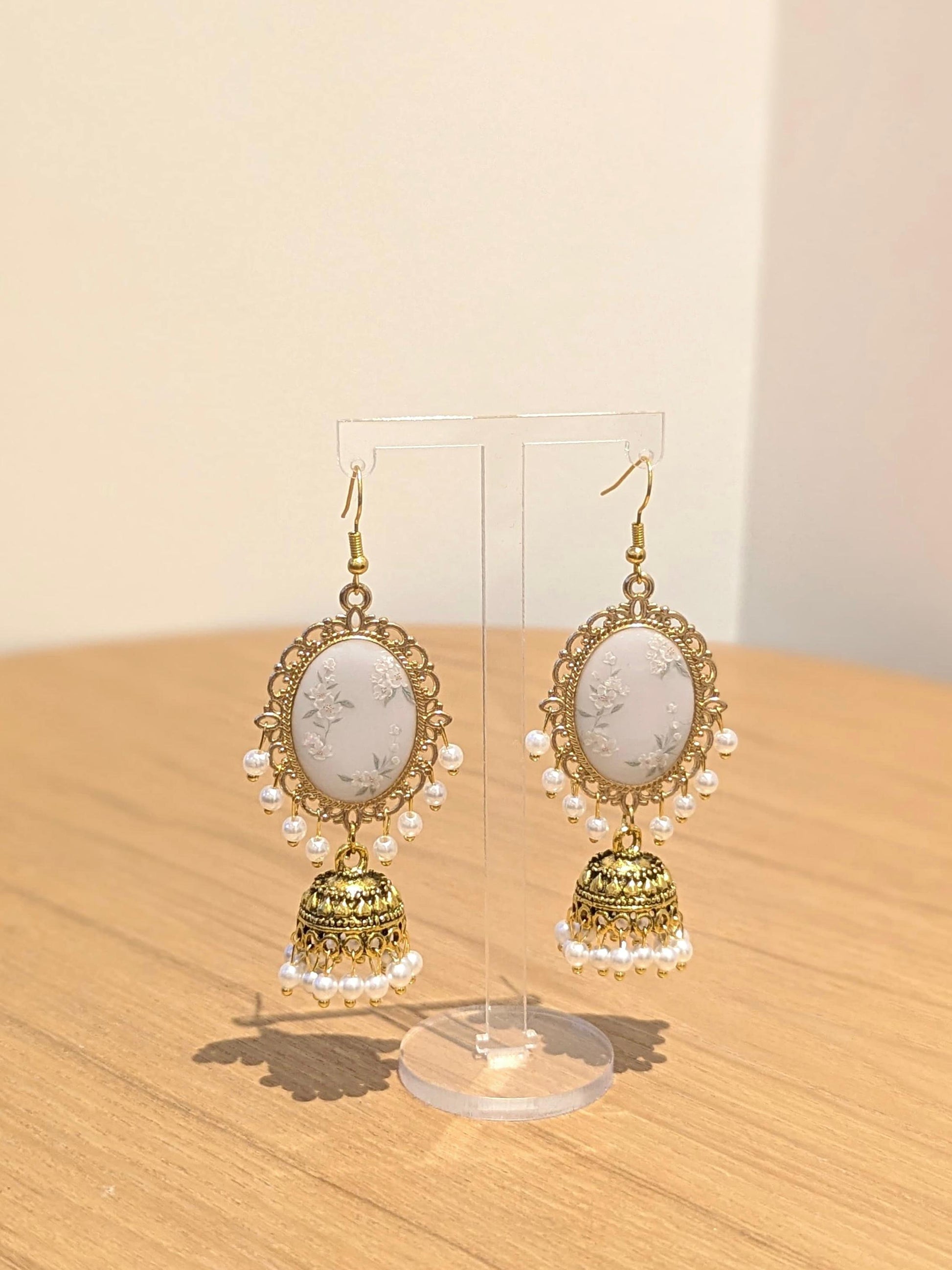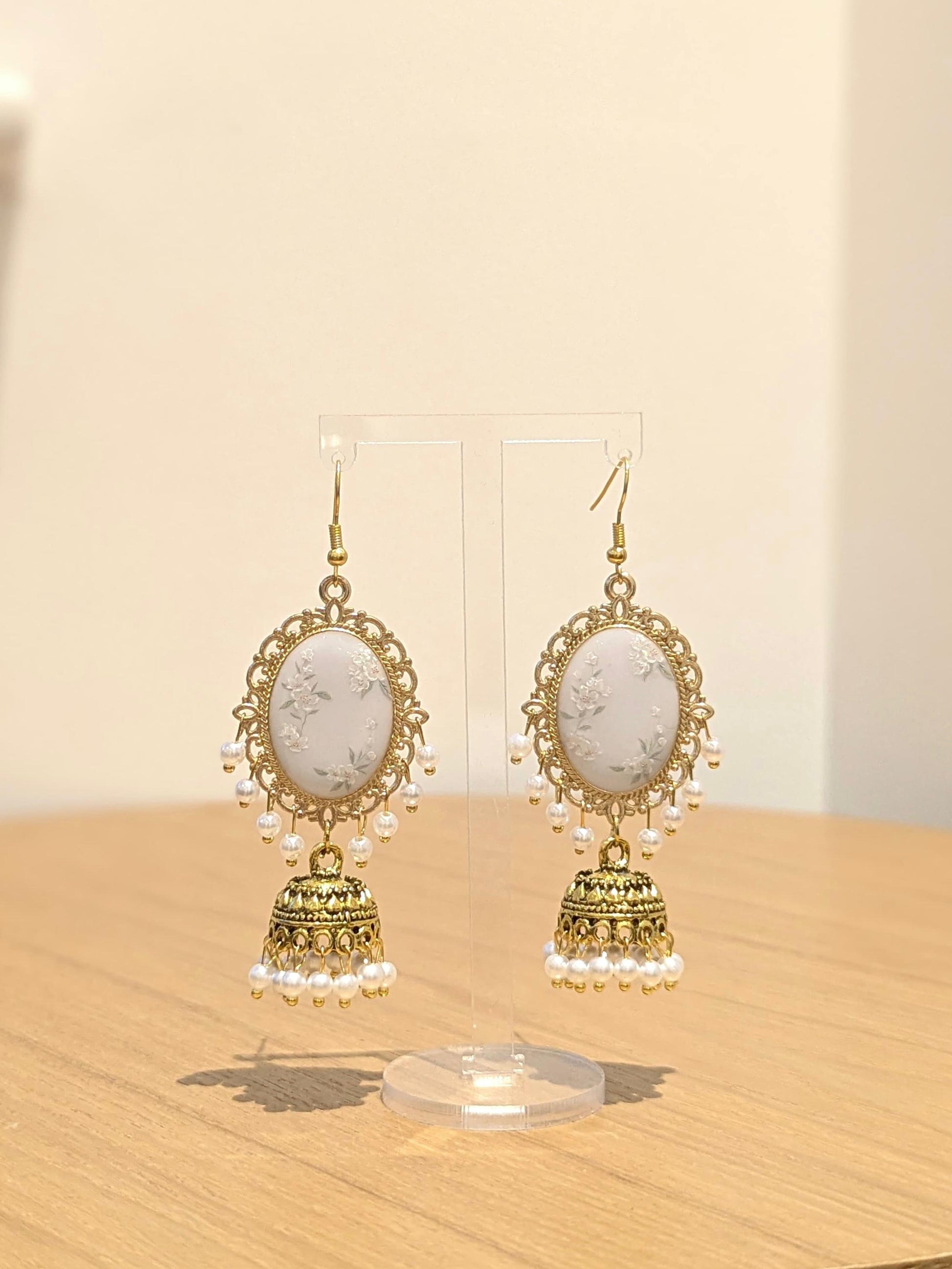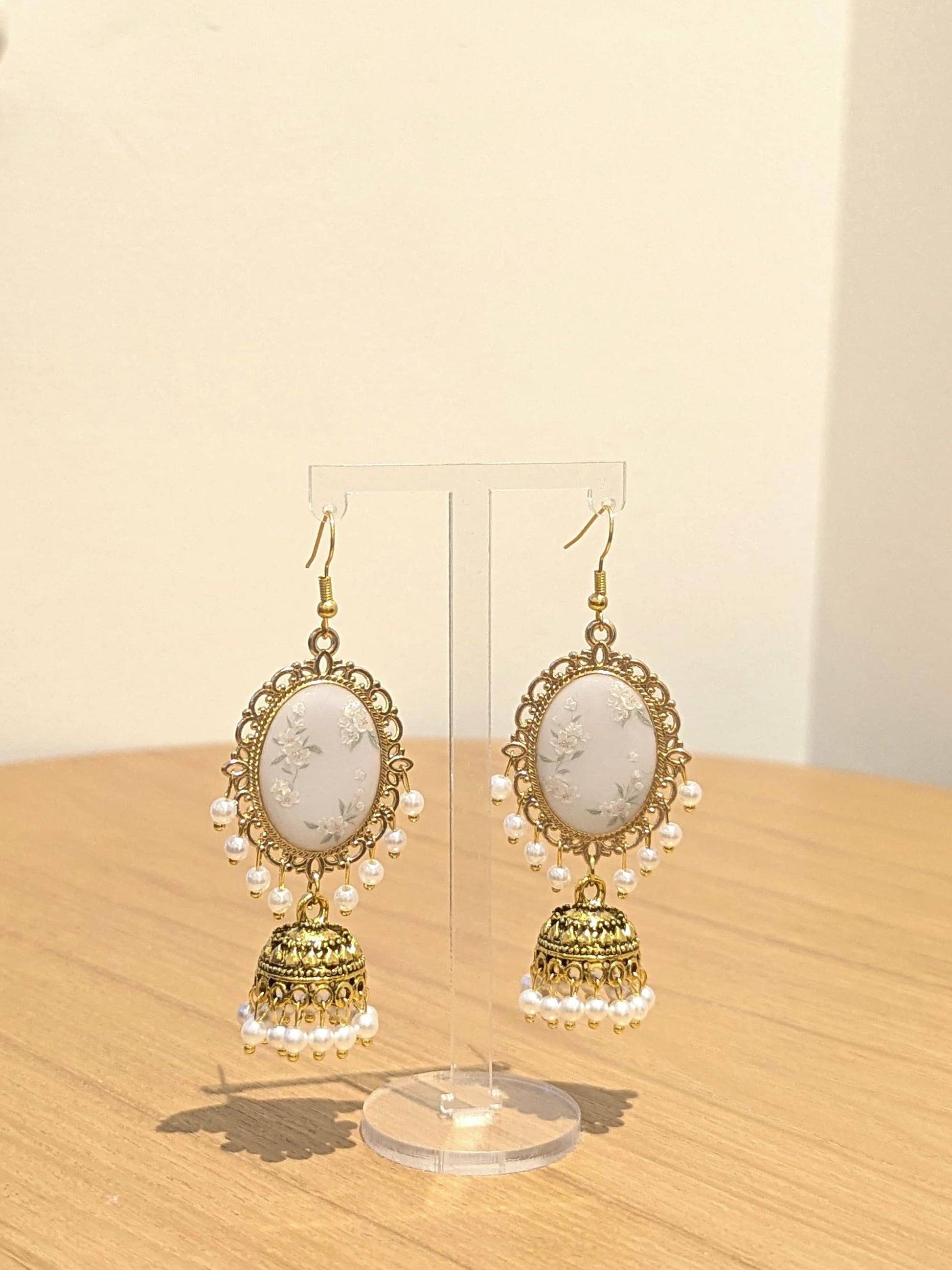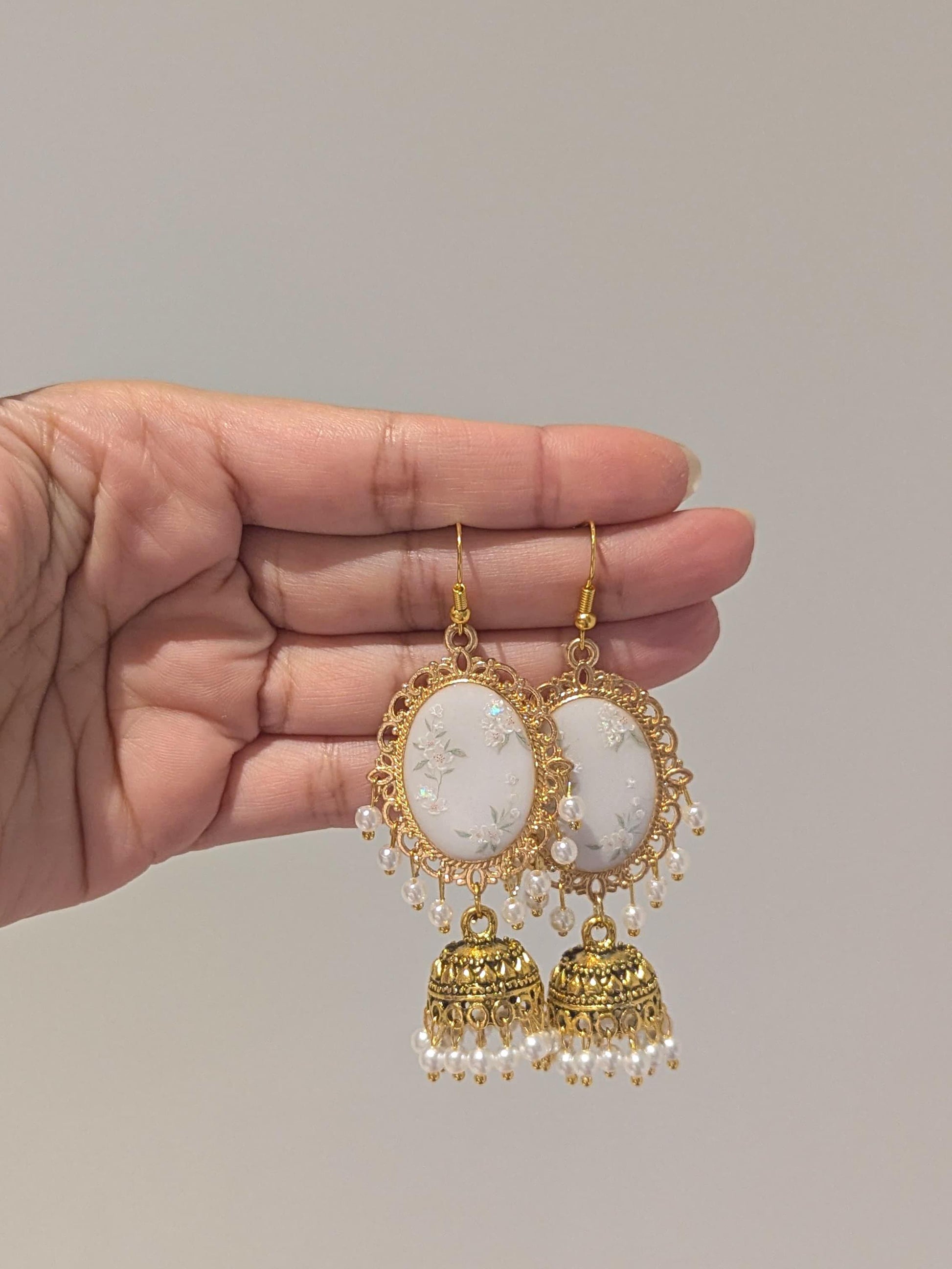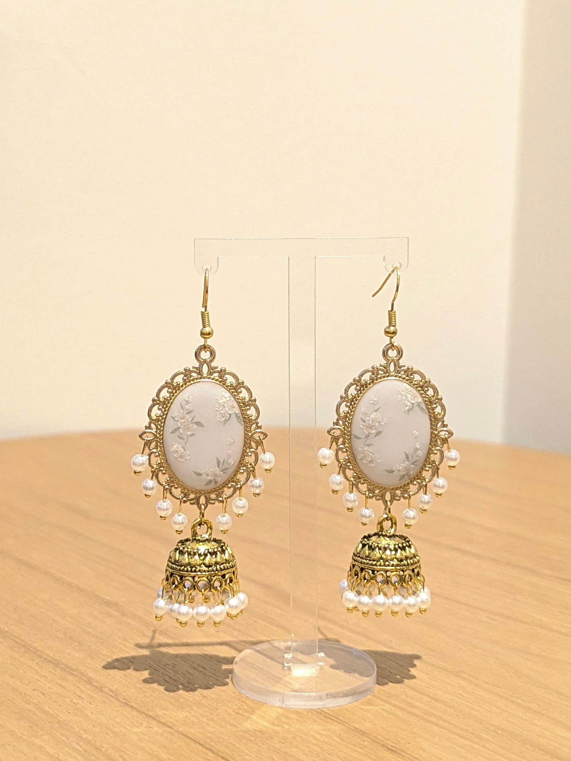White Floral Jhumkay in Gold
